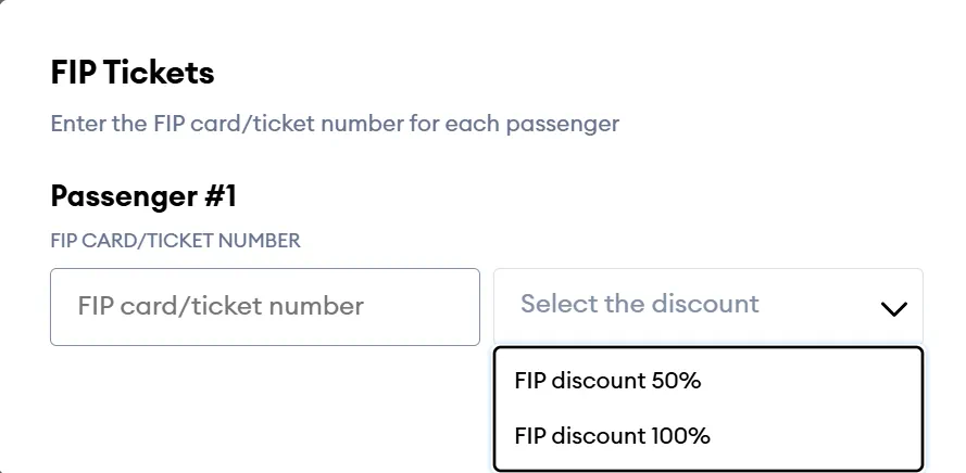 On the LTG-Link booking website, FIP 50 Tickets for LTG-Link connections in Lithuania and Latvia are sold. To add the FIP 50 discount, select the I have FIP card option in the passenger/discounts overview. Then, enter the FIP Card number and select the FIP discount 50% option.